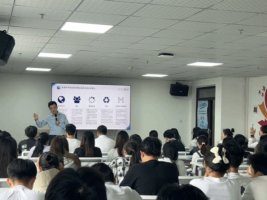 企业高管大讲堂活动现场,王尊龙为我校100多名在校生带来了一场以“ESG浪潮下医药行业的变革与青年人的机遇”为主题精彩讲座。王尊龙先生回顾了自己先后任职于德勤、毕马威等知名咨询机构和扬子江药业集团的工作经历,鼓励学生们聚焦中国老龄化社会发展的变化和医疗行业长期向好发展的趋势,立足医药行业供给侧改革需求和自身优势,从分析医患需求变迁对医药营销模式的创新驱动入手,鼓励同学们在大学生涯中拥抱"韧性成长",通过增强学习力来突破职业发展困境。