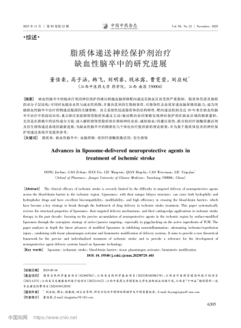 该文系统梳理了脂质体的靶向递送机制,重点阐述表面修饰型脂质体通过“被动渗透-主动识别”协同策略,实现神经保护剂在脑缺血区域的精准蓄积。同时,深入探讨其在抑制神经炎症、减轻缺血/再灌注损伤、协同治疗及仿生膜修饰等方面的前沿进展,尤其在搭载中药活性成分方面表现突出,为缺血性脑卒中的精准治疗与剂型开发提供重要的参考依据和创新方向。