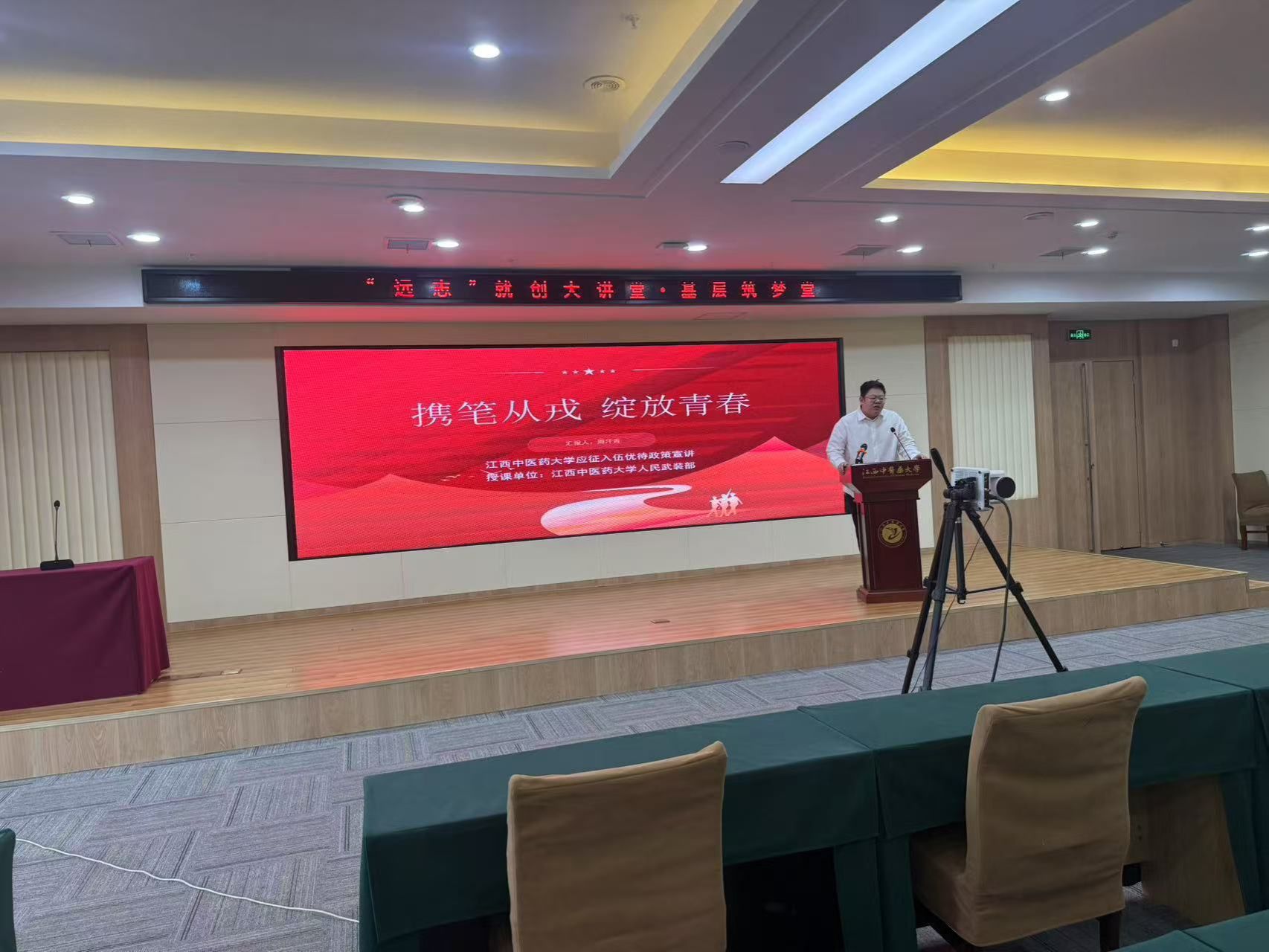 第一位分享嘉宾是江西中医药大学人民武装部专武干事、保卫处校卫队队长周汗青。作为深耕征兵一线近11年的“硬核”领路人,他详细解读了大学生参军入伍的最新政策与优待措施,重点介绍了学生入伍后的专业适配与发展路径,并从兵役登记、体检政审到新兵输送等环节,为同学们梳理了从校园到军营的完整准备流程。周老师严谨务实、饱含热情的讲解,让在场同学对携笔从戎、报效国家有了更清晰的认识。