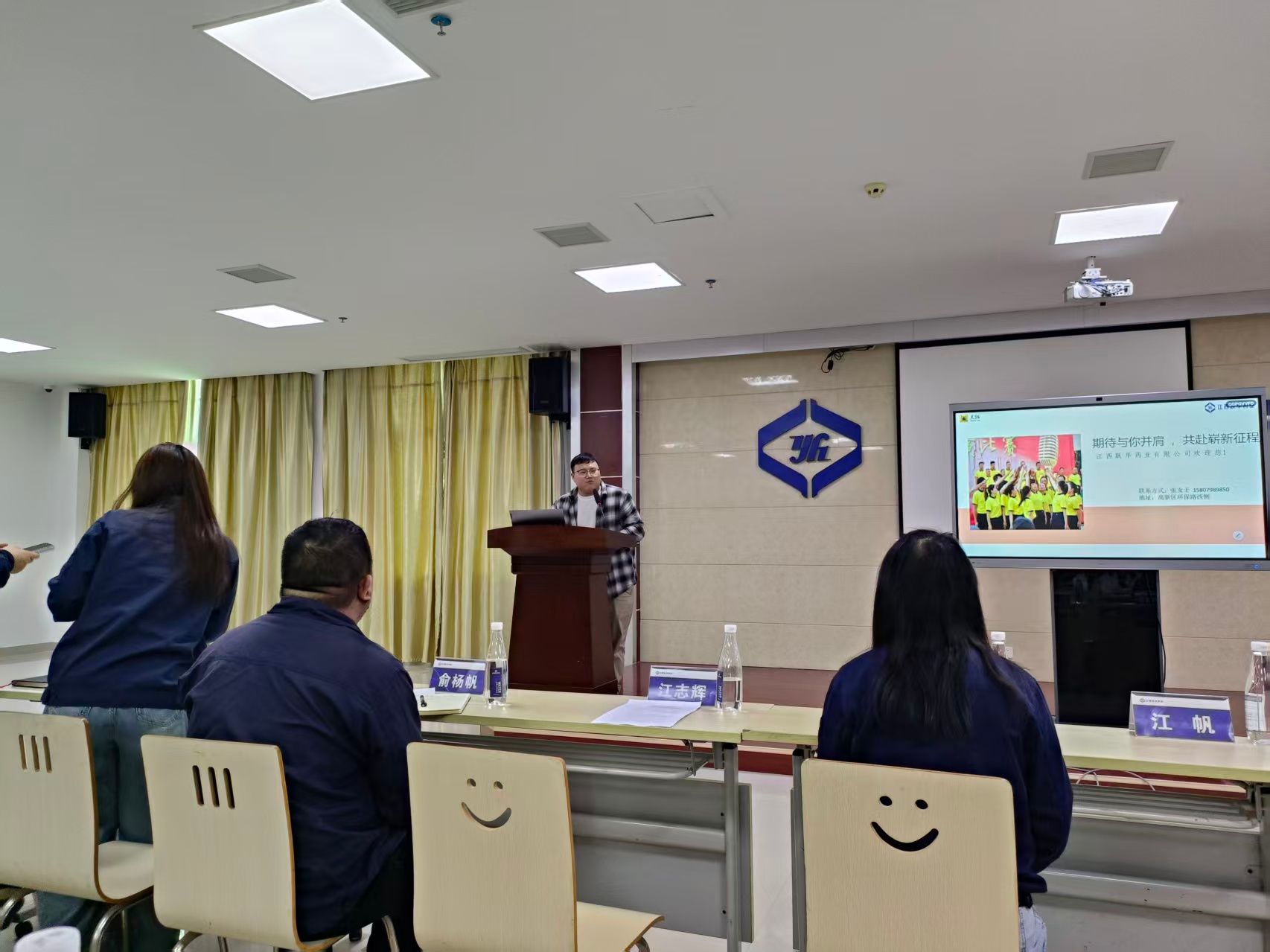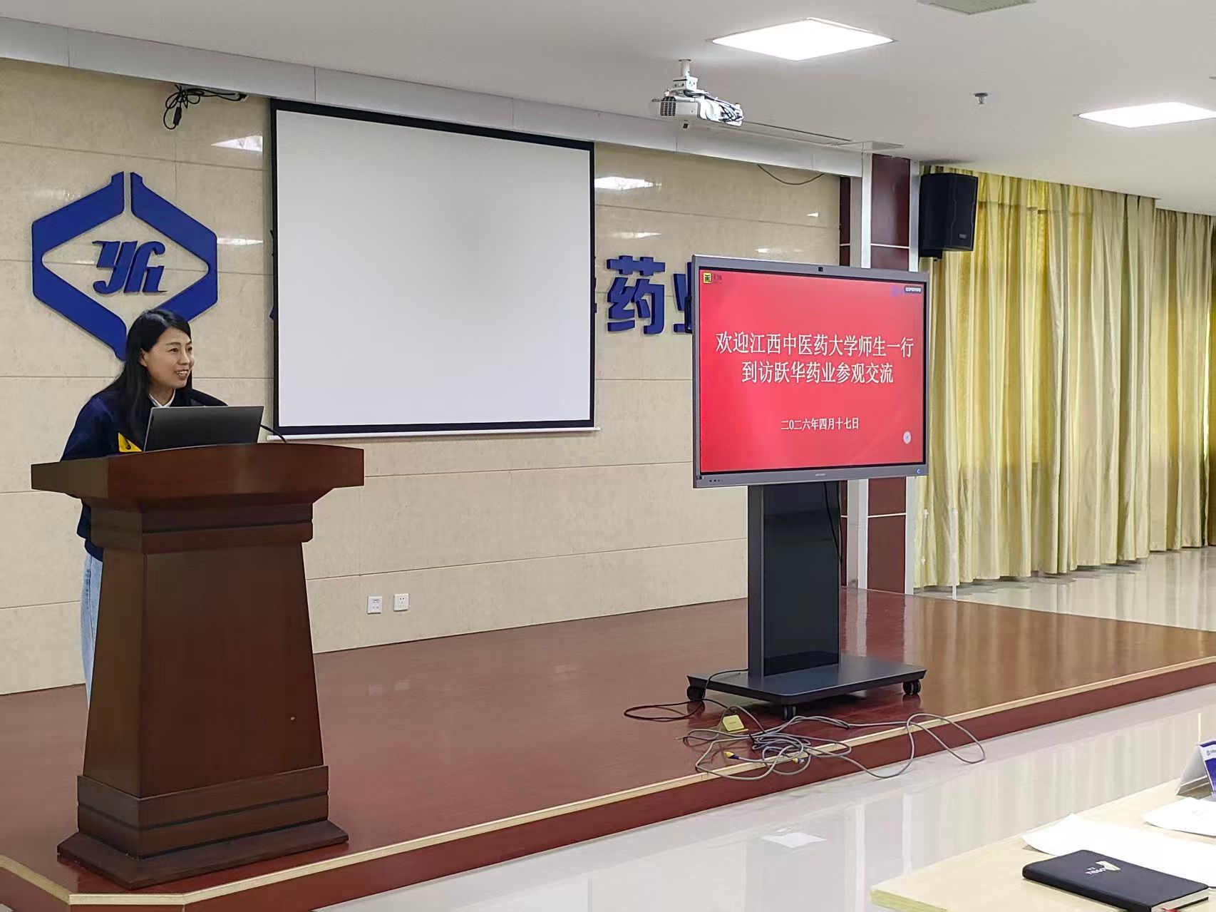 董事长郝丽芳首先致欢迎辞,对药学院师生的到来表示热烈欢迎。她表示,跃华药业始终重视青年人才的引进与培养,希望通过此次活动,让同学们更直观地感受企业发展脉搏,找到施展才华的舞台。随后,企业人力负责人通过精心准备的PPT,从公司发展历程、核心业务板块、产业布局及未来规划等方面进行了详细介绍。一组组翔实的数据、一张张生动的图片,让在场师生对企业有了更加立体和全面的认识。带队老师代表学院介绍了药学院毕业生的整体就业情况。他表示,学院始终将毕业生就业工作摆在突出位置,通过“走出去、请进来”等多种形式,积极搭建校企供需对接平台,努力为毕业生拓宽就业渠道、创造更多优质岗位。